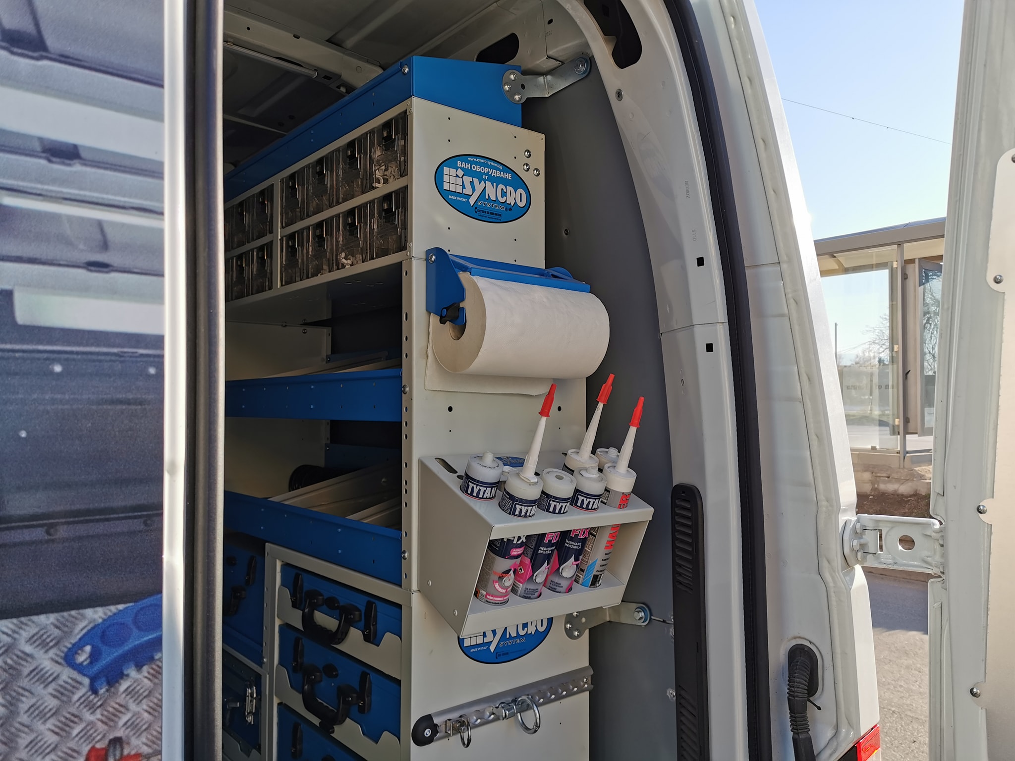 Държачи за бутилки със спрей и силикон, скоби за туби, скоби за пожарогасител и специални комплекти за остри предмети, закачалки в различни размери, аптечки и други аксесоари може да намерите в каталога на Syncro-system и да поръчате при нас.