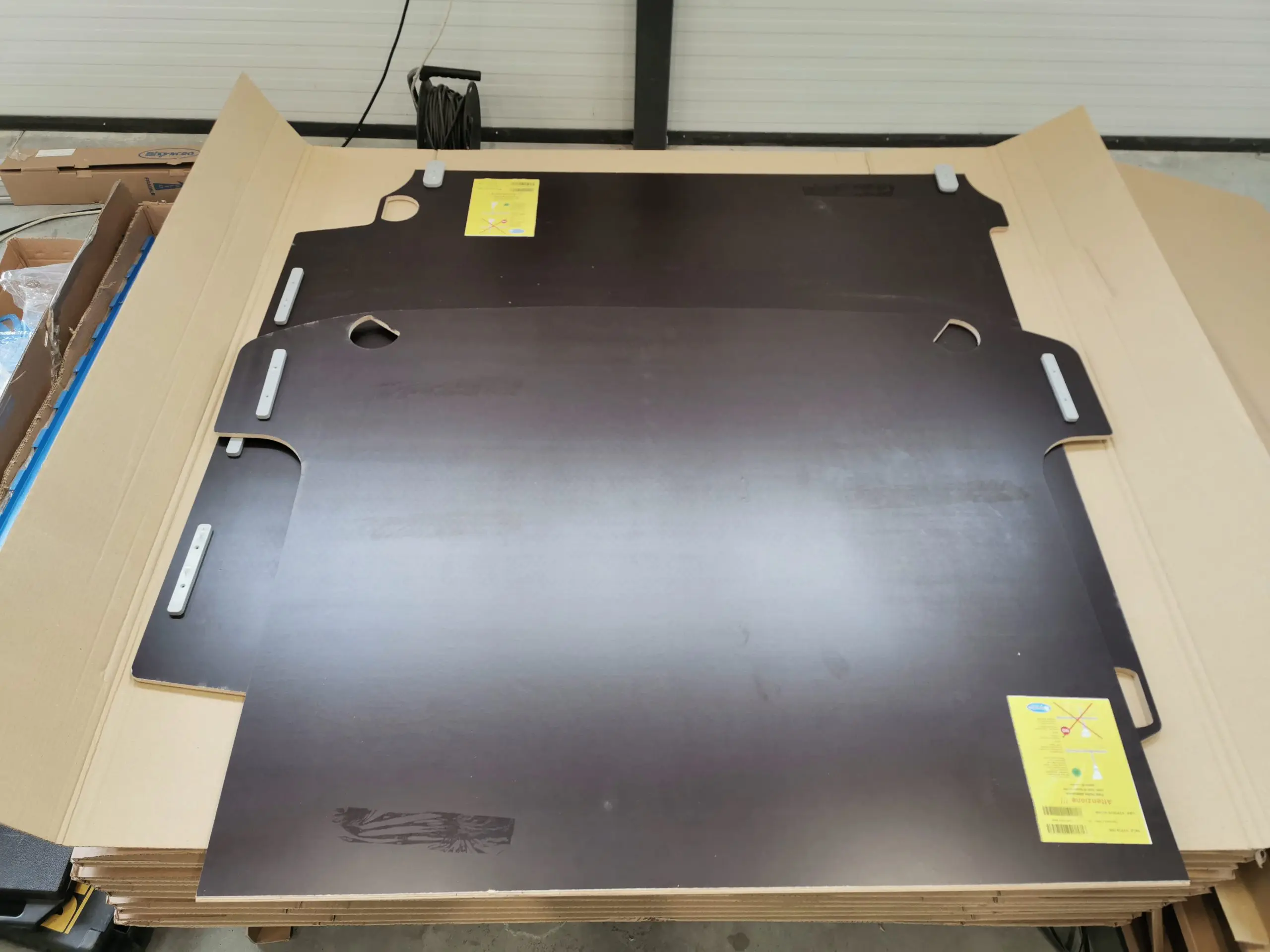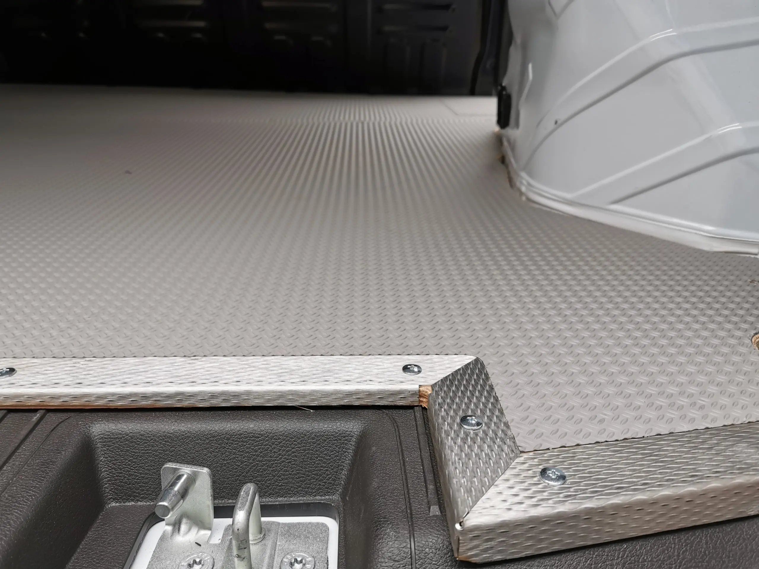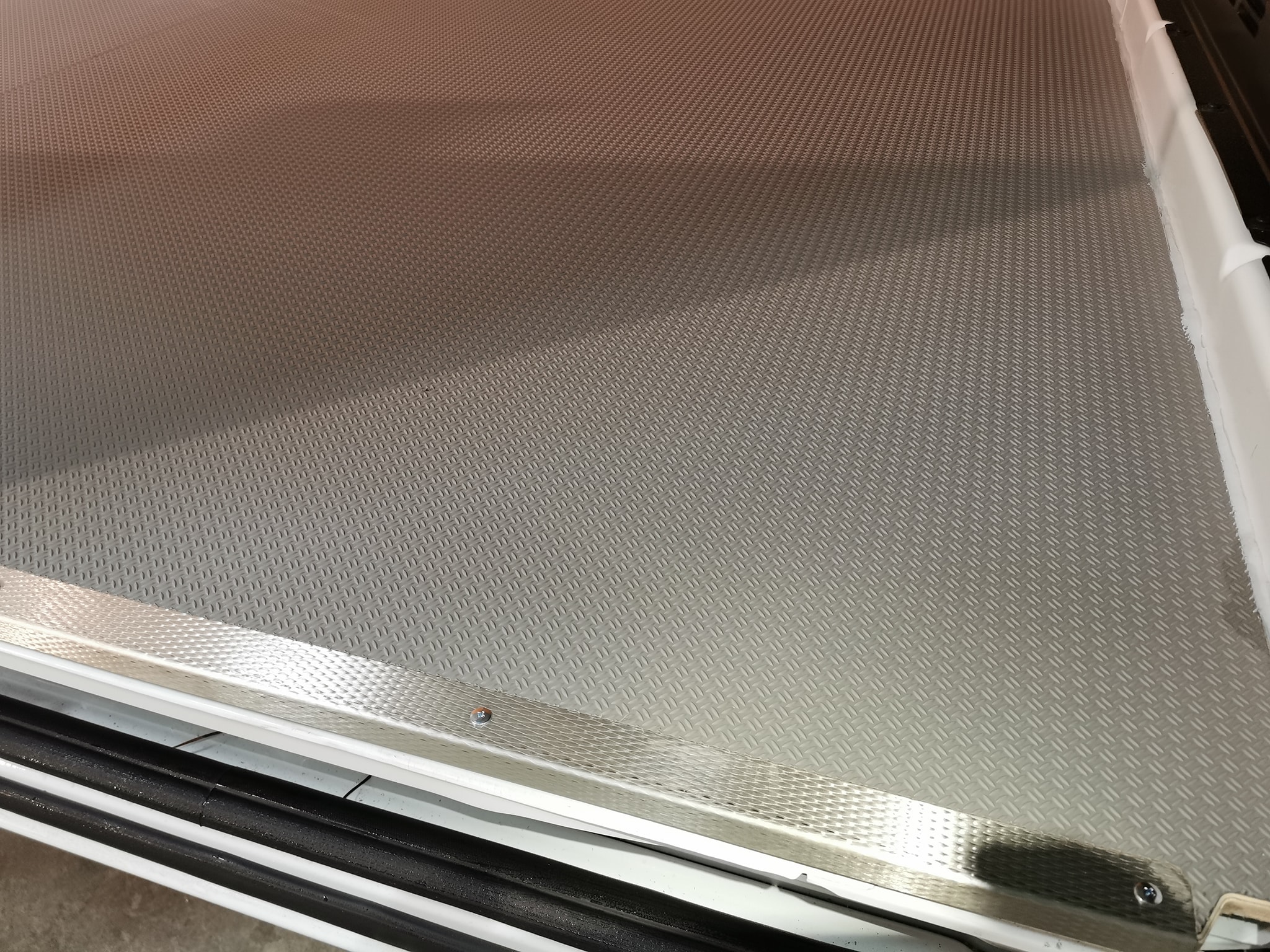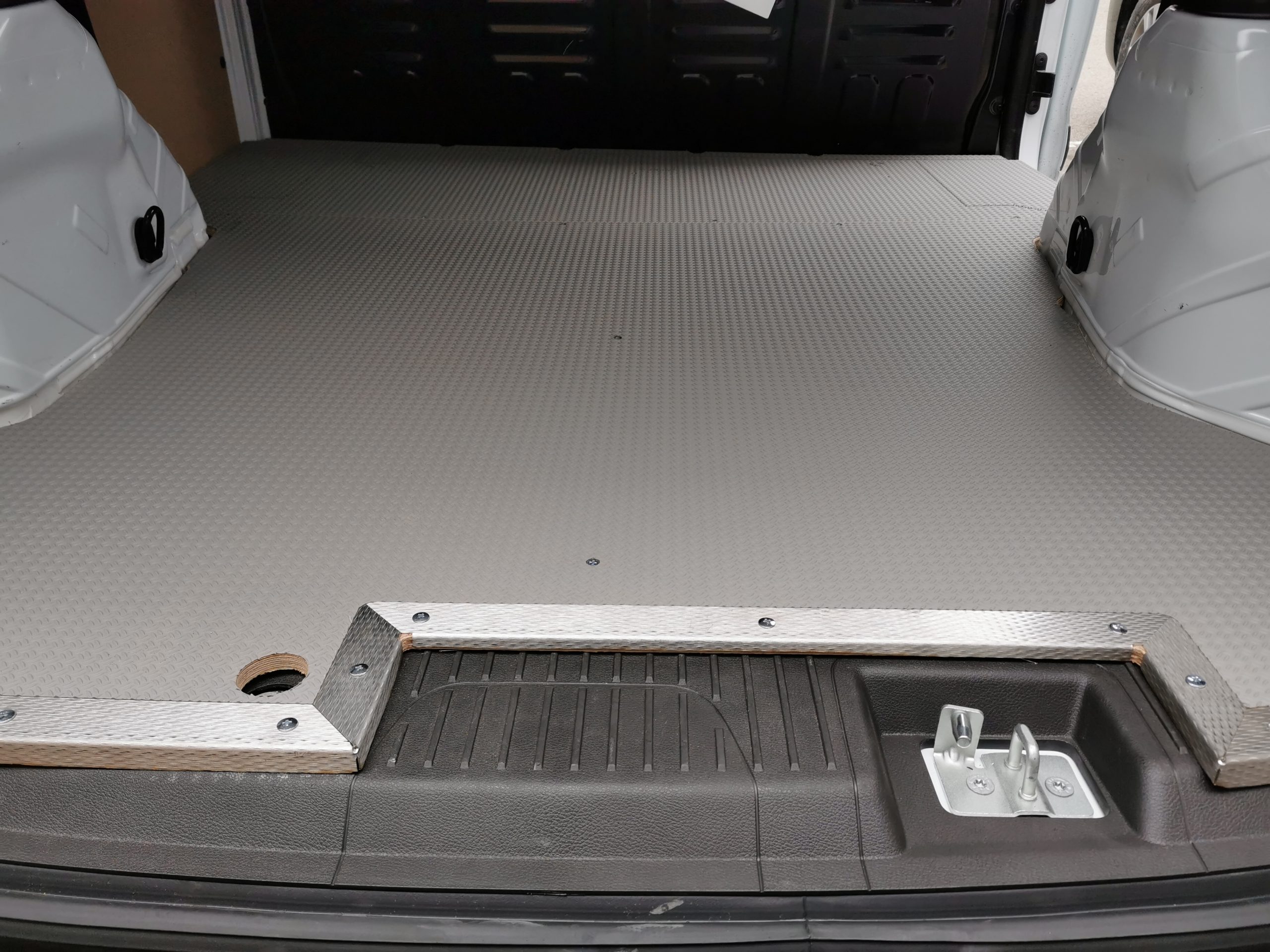 За двойно по-устойчив и практически недеформируем подов панел, предлагаме панел от два сдвоени материала: дървена плоскост отдолу и алуминиева рифелова ламарина отгоре. От страните към вратите, между двата слоя е монтиран предпазен удароустойчив стоманен кант. Релефната повърхност предотвратява хлъзгането. Този изключително здрав под за бус е идеален за транспорт на тежки товари.