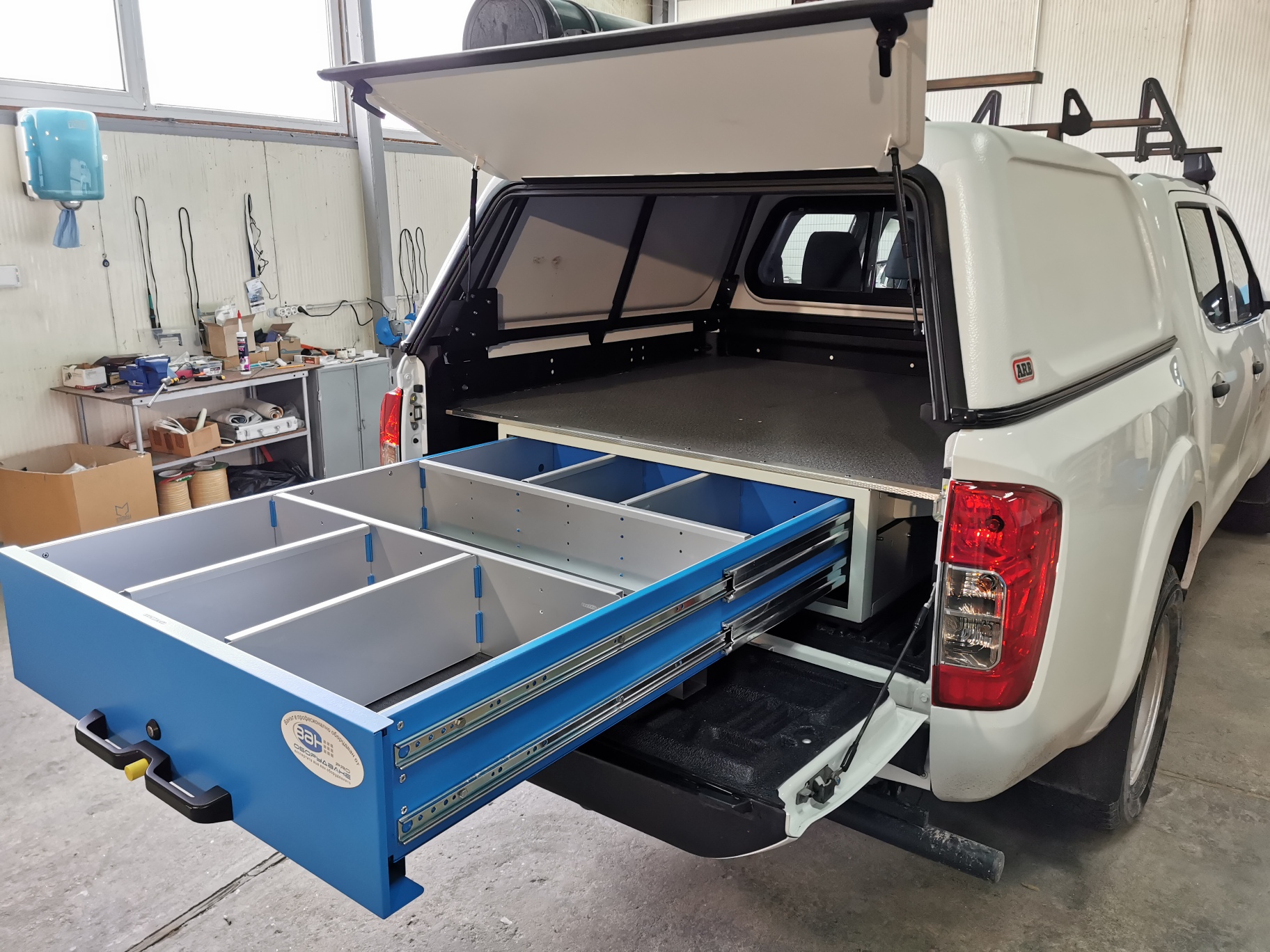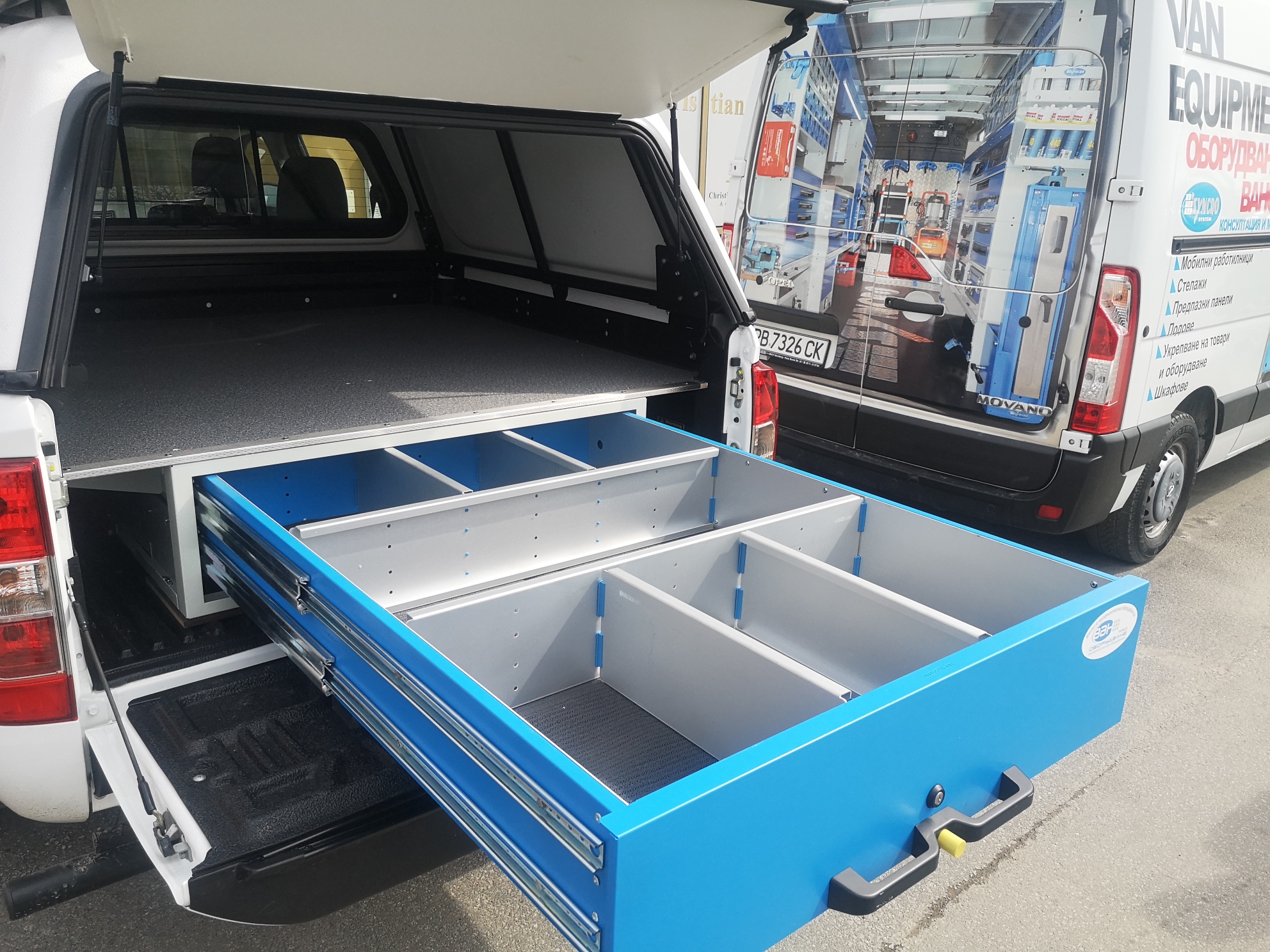 KIT подово чекмедже за пикап представлява едно чекмедже, в което чрез метални разделители са обособени отделения за разделно съхранение на инструменти, добавени са и гумени нехлъзгащи се подложки. В комплекта е включена ключалка и система за задържане в 4 позиции: отворено, затворено и в две междинни позиции.
