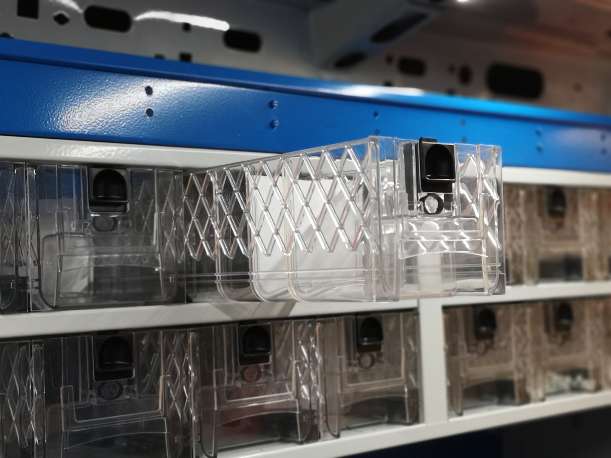 Предлагаме прозрачни чекмеджета, които се отварят се чрез накланяне или изваждане. Гамата прозрачни чекмеджета се произвежда от удароустойчивия и маслоустойчив материал PMMA,който е издръжлив на UV-лъчи и следователно незастрашен от пожълтяване. Същият вид пластмаса се използва за прозорчетата на самолетите: ето защо можем да гарантираме, че е действително здрав!