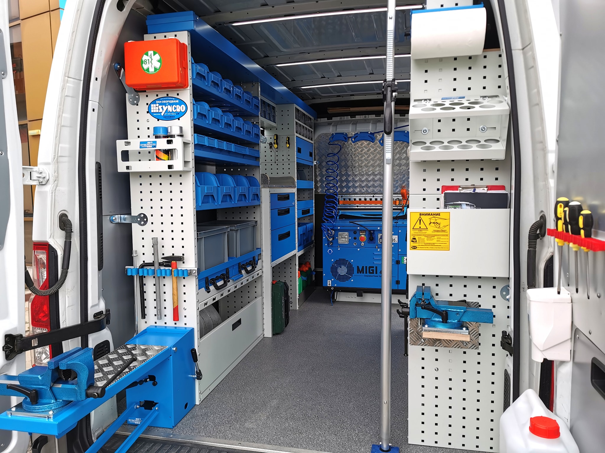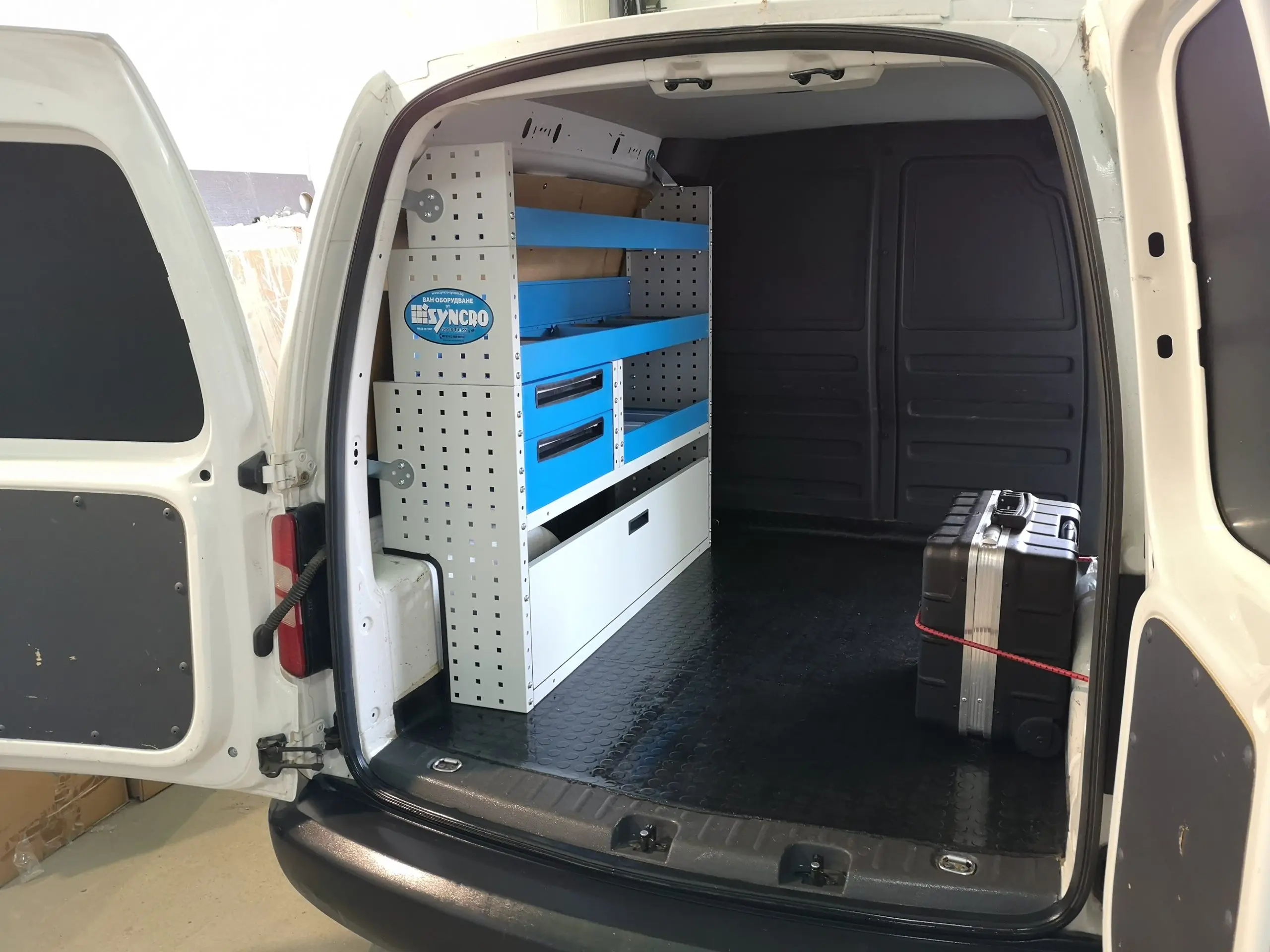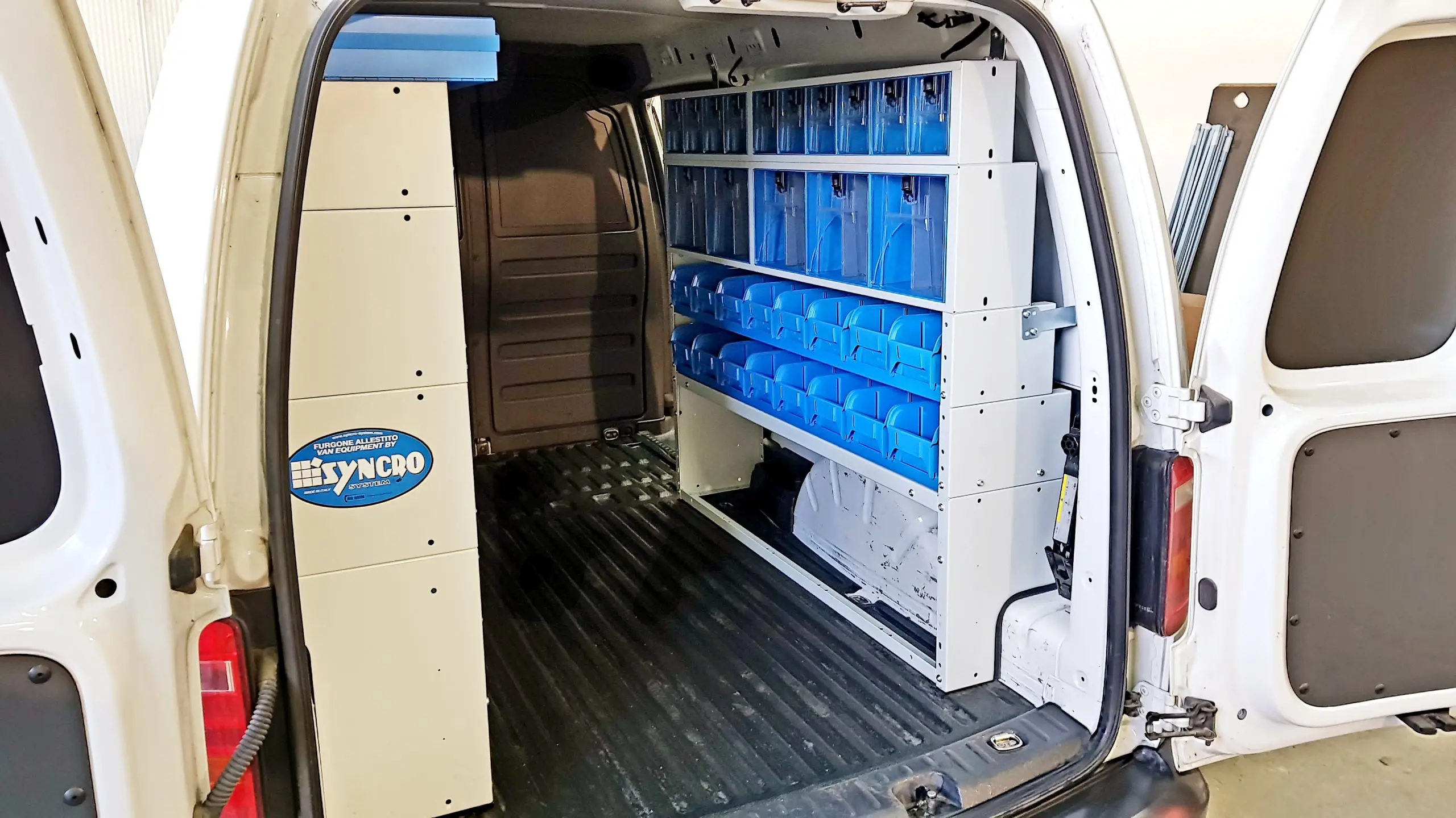 Стелажите с отворени рафтове са за предпочитане за съхранение и транспорт на резервни части. Те са снабдени с алуминиеви разделители, разположени в дълбочина. Разделителите осигуряват инструментите да стоят по местата си, въпреки вибрациите по време на движение. Разделителите се поставят на различно място изключително лесно и могат да се премахват, когато е необходимо. На дъното на всеки отворен стелаж е разположена нехлъзгаща се подложка от нетъкан текстил. Рафтовете се поставят под наклон от 6 градуса за допълнителна сигурност при движение.
