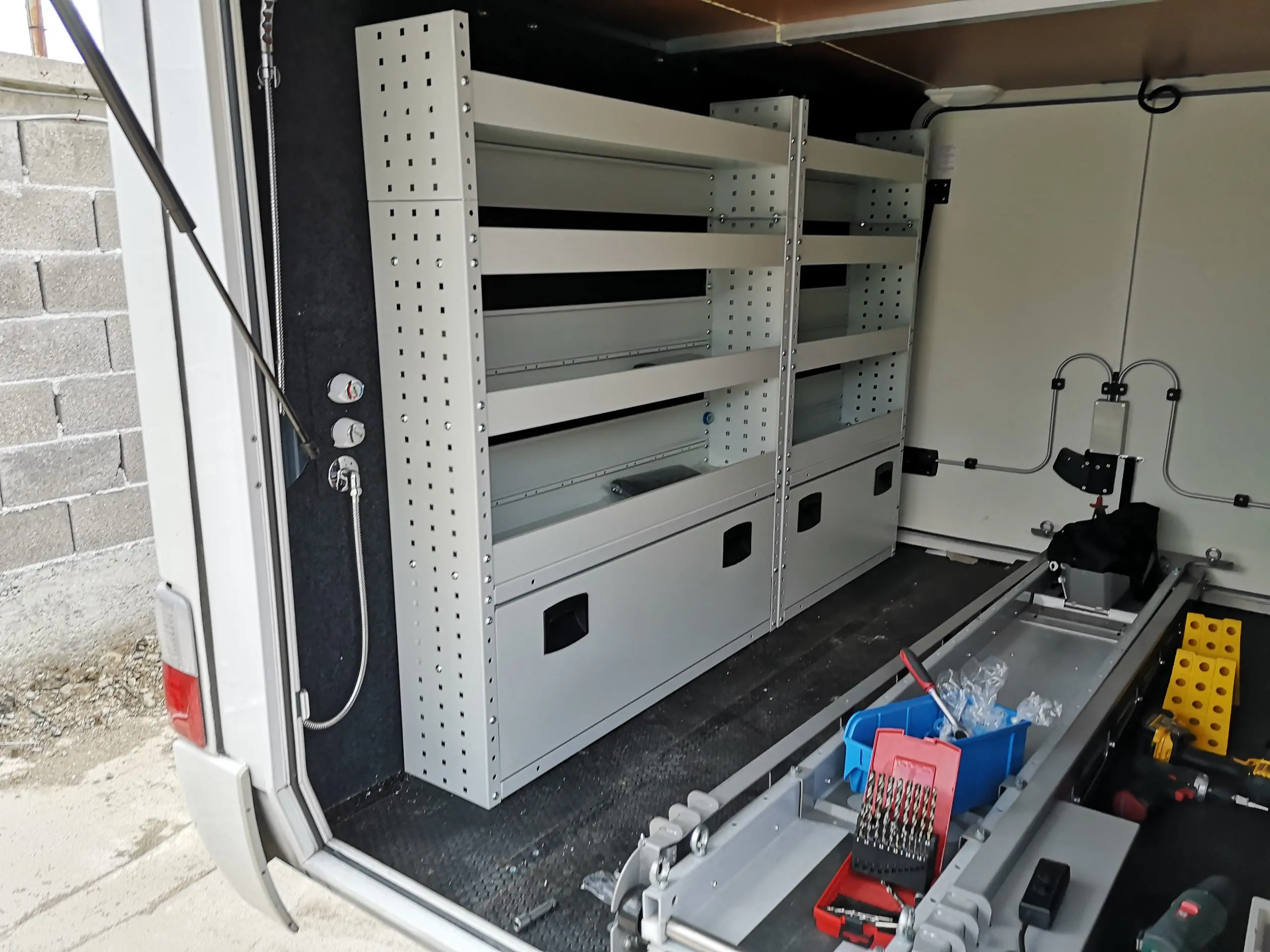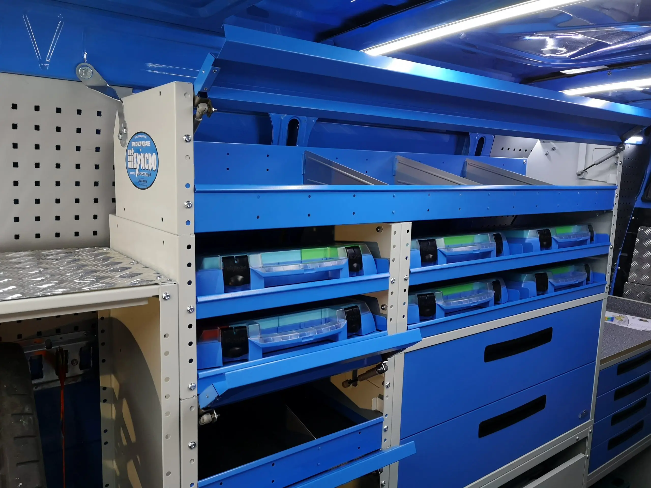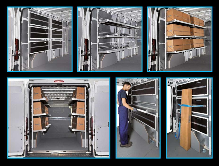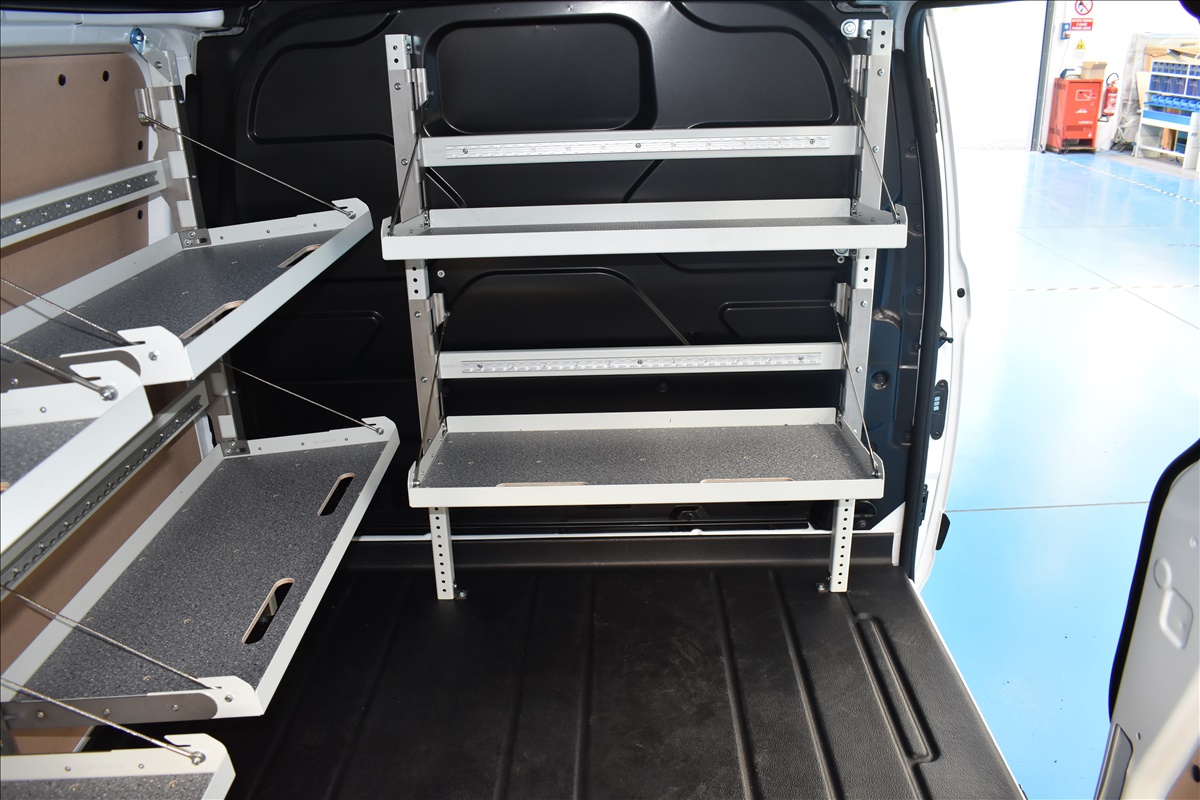 Стелажите са сред най-търсените продукти за оборудване на ван. За да са едновременно здрави и леки, стелажите се произвеждат алуминий и високоякостна стомана, която е с 25% по-устойчива от стандартната и позволява да се увеличи полезния товар, защото е с до 30% по-лека. Стелажите могат да се проектират в различни варианти, с различни размери.